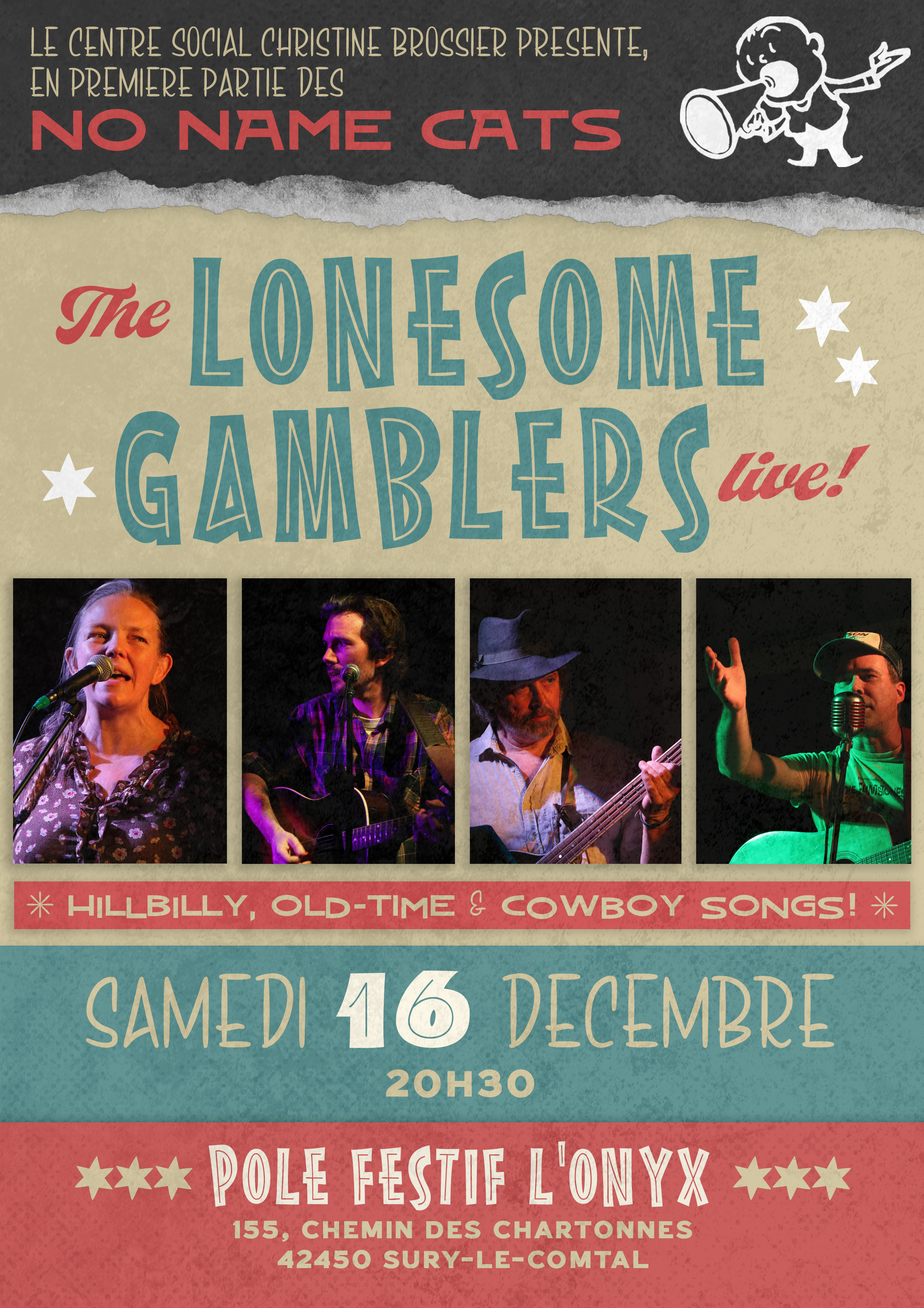 Deux concerts foréziens avant Noël ! Les Lonesome Gamblers seront en concert le 8 décembre à la Salle des fêtes de Roche-en-Forez et le 16 décembre au Pôle festif l'Onyx à Sury-le-Contal (en première partie des No Name Cats) !